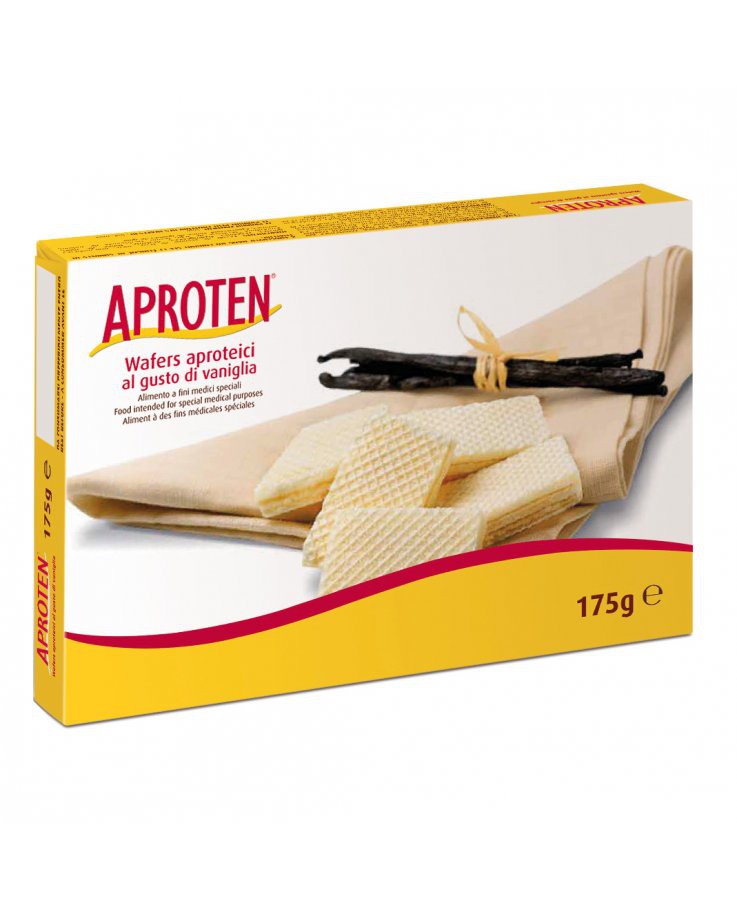 La linea di prodotti Aproten, caratterizzata da un contenuto basso, garantito e costantemente controllato di proteine, sodio, potassio, tirosina e fenilalanina, è specificatamente studiata per il trattamento dietoterapeutico di alcune patologie: insufficienze renali (nefropatie), aminoacidopatie metaboliche (fenilchetonuria, tirosinemia) e malattia di Parkinson (in terapia con Levodopa). I wafer Aproten sono ideali per uno snack piacevole e goloso. Le pratiche confezioni li rendono adatti anche per essere gustati fuori casa.