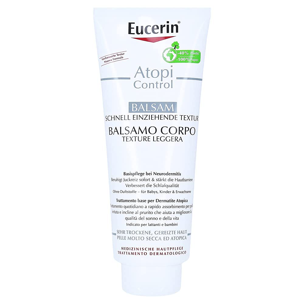 Eucerin AtopiControl Balsamo Corpo è un trattamento base quotidiano che è stato specificamente formulato per lenire ed idratare intensamente la pelle irritata e pruriginosa. Il balsamo olio-in-acqua leggero ma nutriente è arricchito di licocalcone A lenitivo, ceramidi e burro di karité per rafforzare la naturale barriera cutanea e donare sollievo alla secchezza e al prurito. Dovrebbe essere usato durante una riacutizzazione insieme a Eucerin AtopiControl Crema Fasi Acute, Eucerin Spray Anti-Prurito e al tuo farmaco abituale.