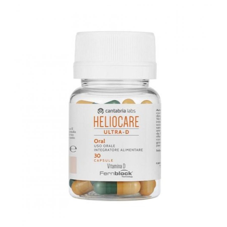 Integratore alimentare a base di Polypodium Leucotomos, Vitamina D, Vitamina C e Vitamina E, sostanze antiossidanti che contribuiscono alla protezione delle cellule dallo stress ossidativo. L’utilizzo di Heliocare Ultra D è utile per tutte le presone che svolgono attività lavorativa, sportiva , di hobby etc., all’aria aperta. È particolarmente indicato ad esempio per soggetti a rischio quali Fototipo I e II, persone che sviluppano facilmente eritema, pazienti affetti da fotodermatosi, vitiligine ecc.