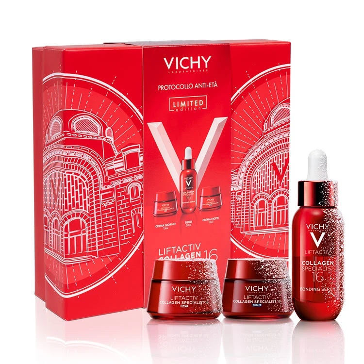 Vichy Liftactiv Collagen Specialist Box Natale 2025 è un trattamento skincare anti-età completo, studiato per contrastare la perdita di collagene, migliorare tonicità, compattezza e definizione del viso.